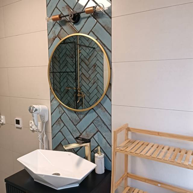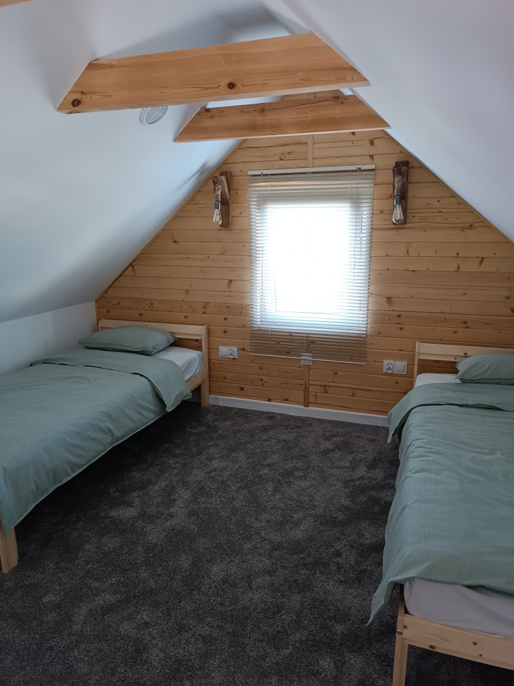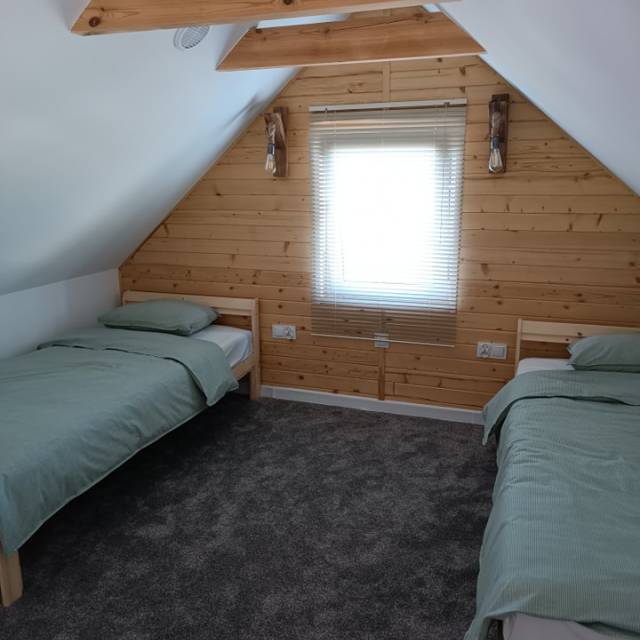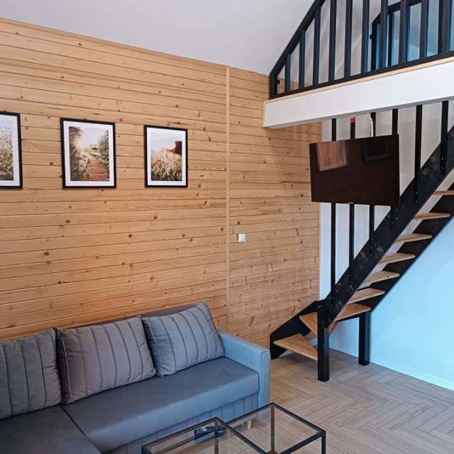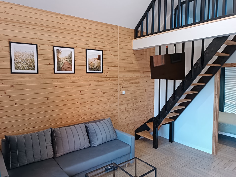 Inside each cottage there is a spacious living room, a bedroom, a bathroom with a shower, and a mezzanine with two single beds.