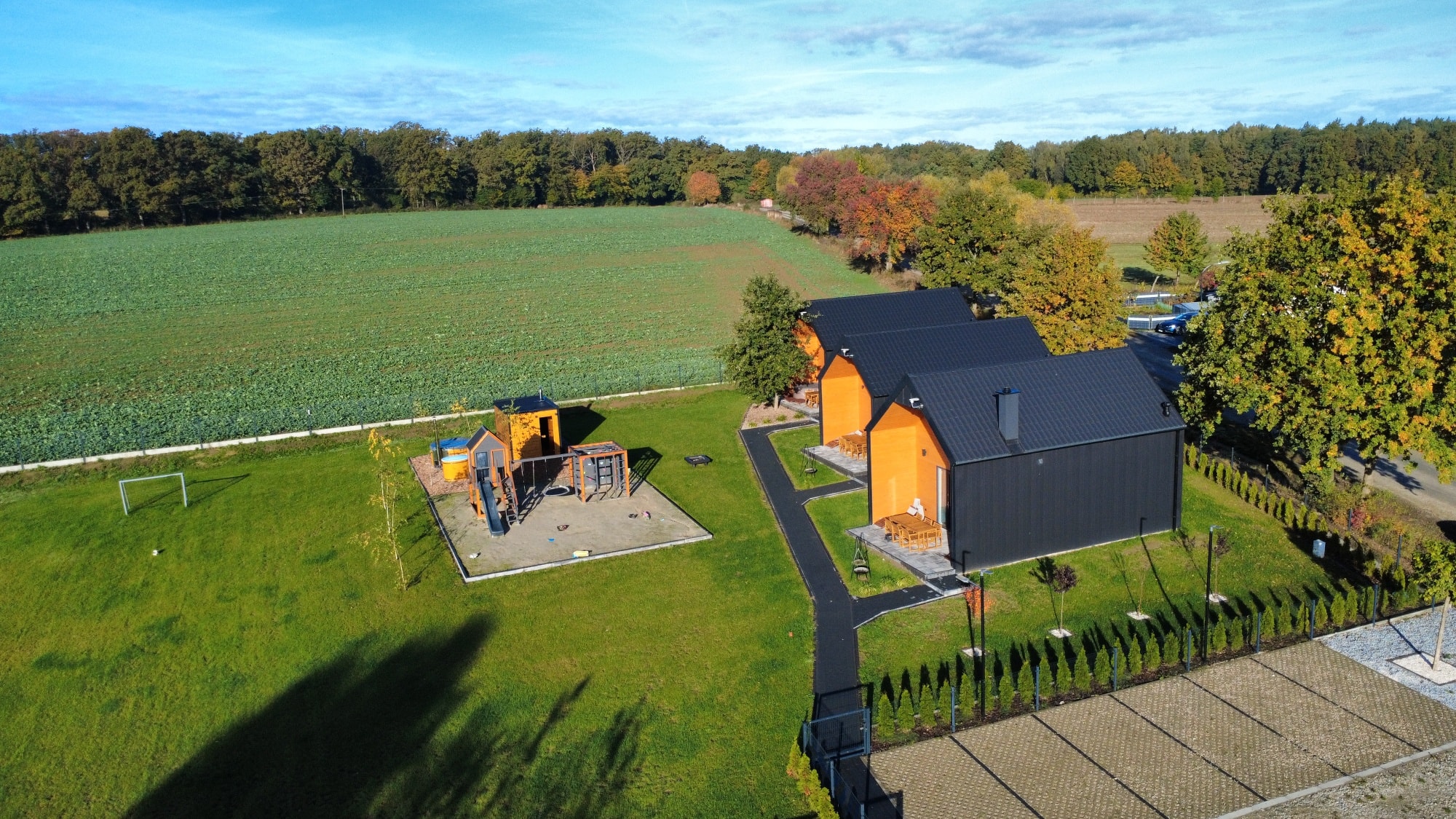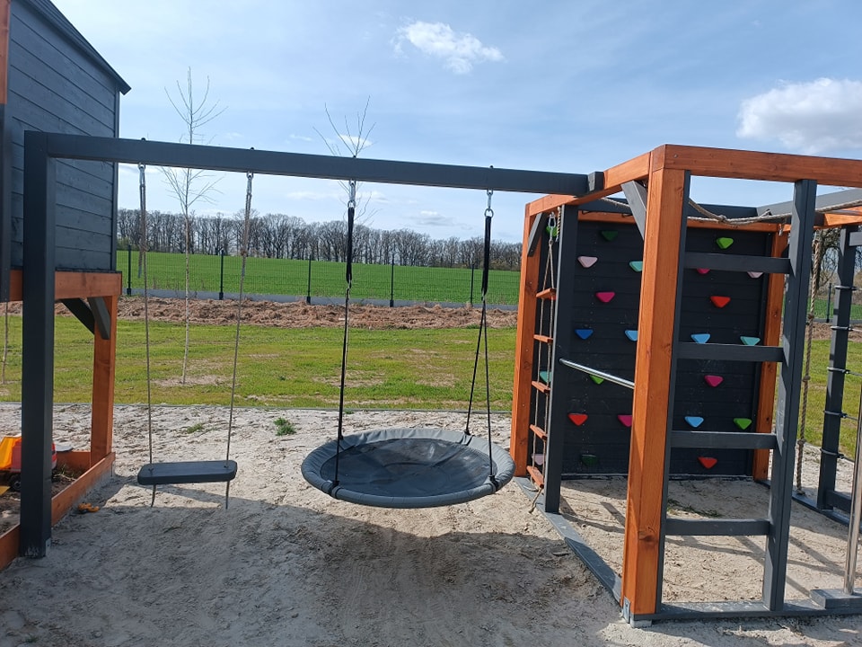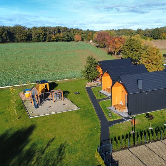 Each cottage also has a large terrace where you can enjoy breakfast al fresco, read a book or simply relax to the sound of birdsong. There is a safe playground for children, and the whole area is ideal for family walks, bike rides and exploring the charms of the nearby ponds and woods.